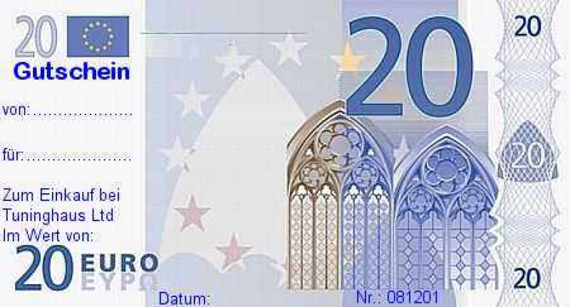 Auf vielfachen Wunsch: Ein Warengutschein zum Einkauf bei Tuninghaus. Wenn die Zeit nicht gereicht hat, die Wünsche zu speziell sind, oder zu groß, dann bieten sich die Geschenkgutscheine von Tuninghaus an. Sie stehen nicht einfach mit leeren Händen da, sondern Sie drucken die PDF-Musterdatei aus und haben einen vorläufigen Gutschein als Geschenk und wir schicken Ihnen den echten und eintauschbaren Gutschein mit der Post schnellstmöglich zu. Bitte beachten Sie: Kein Umtausch und keine Barauszahlung möglich.